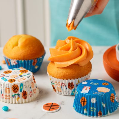 Muffin soffici con frosting decorati con piccoli dettagli di zucchero 2D che incantano.