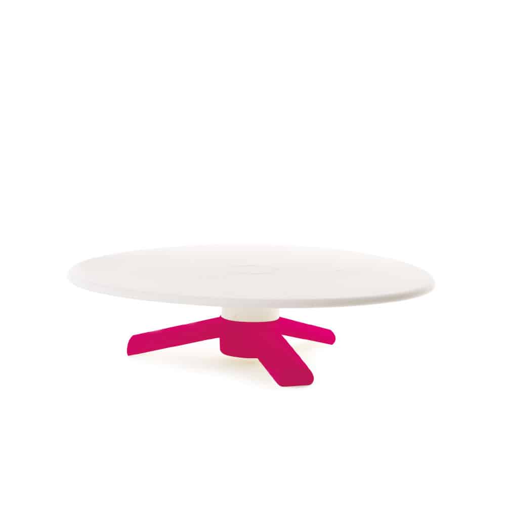 In plastica. Si presta benissimo alla presentazione di tortine, cupcakes, dolcetti e biscotti. È costituita da due pezzi smontabili,lavabili in lavastoviglie.