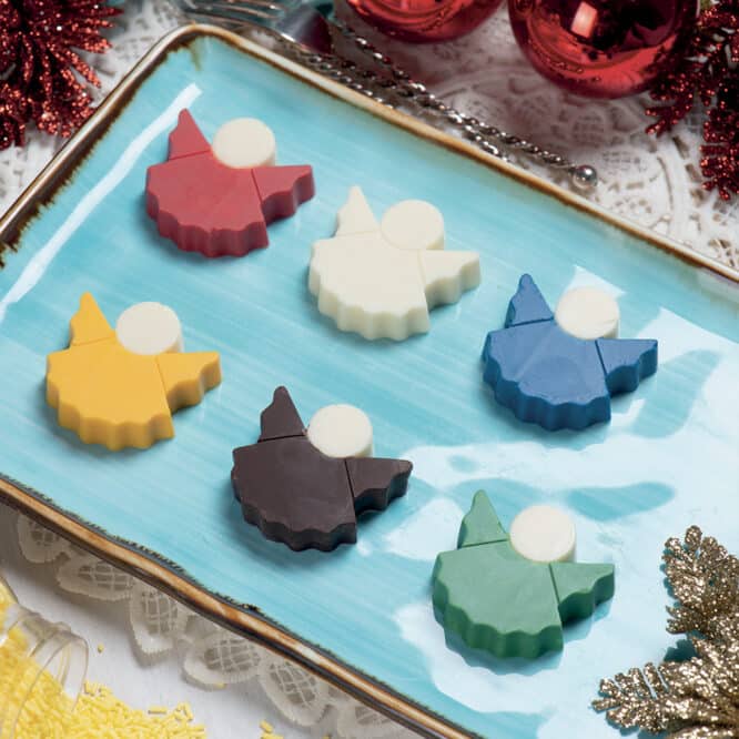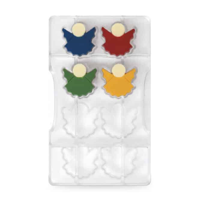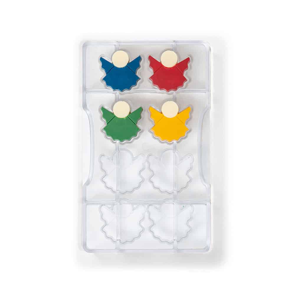 Stampo professionale in policarbonato, un materiale che consente di ottenere cioccolatini lucidi e perfetti. E’ importante temperare bene il cioccolato prima di versarlo nello stampo.