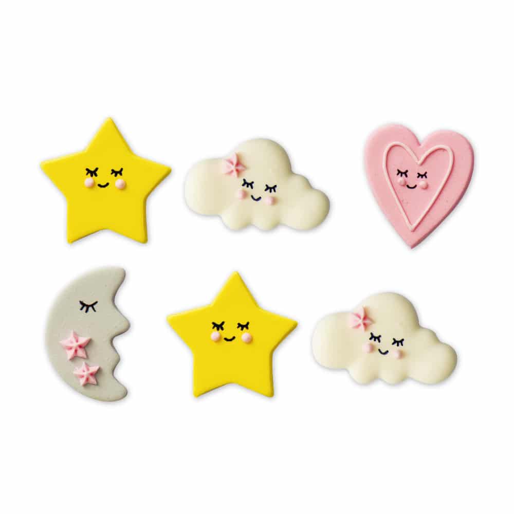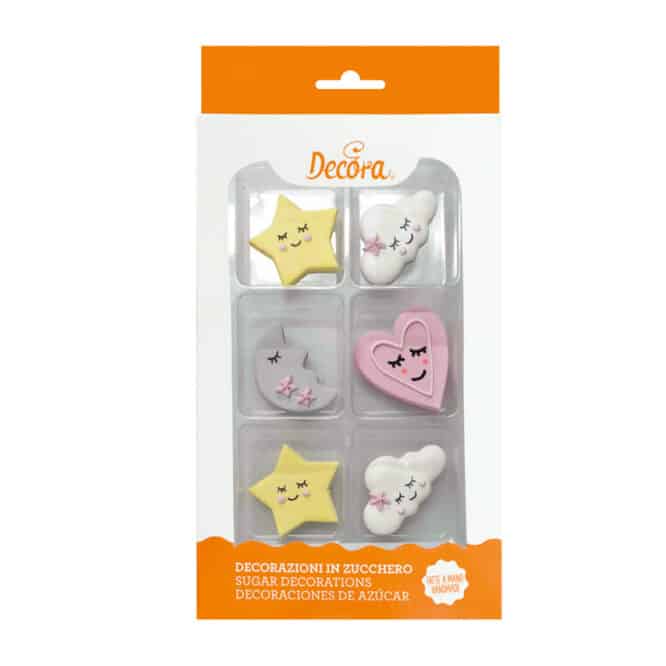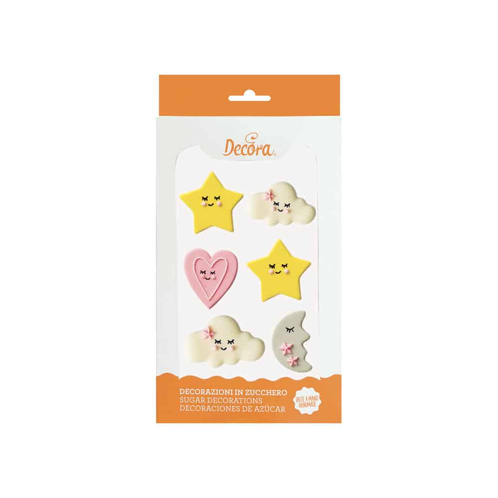 Decorazioni in zucchero, pronte all’uso. Realizzate a mano con coloranti di estrazione naturale. Perfette per decorare facilmente torte, cupcakes, biscotti e dolcetti. Confezione da 6 pezzi assortiti.