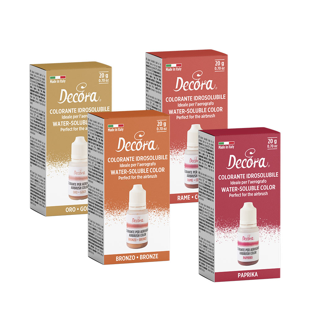 Coloranti idrosolubili liquidi dalle tonalità metalliche, ad uso alimentare. Ideali per l’uso con aerografo. Agitare bene prima dell’uso.
