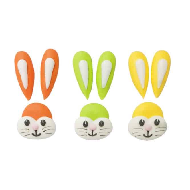 Decorazioni in zucchero, pronte all’uso. Realizzate a mano con coloranti di estrazione naturale. Perfette per decorare facilmente torte, cupcakes, biscotti e dolcetti. Confezione da 3 coniglietti assortiti.