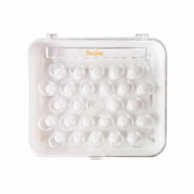 Comodo organizer porta cornetti in plastica, perfetto per conservare fino a 26 cornetti standard, due adattatori con cappuccio salva-freschezza e spillo per fiori piccolo.