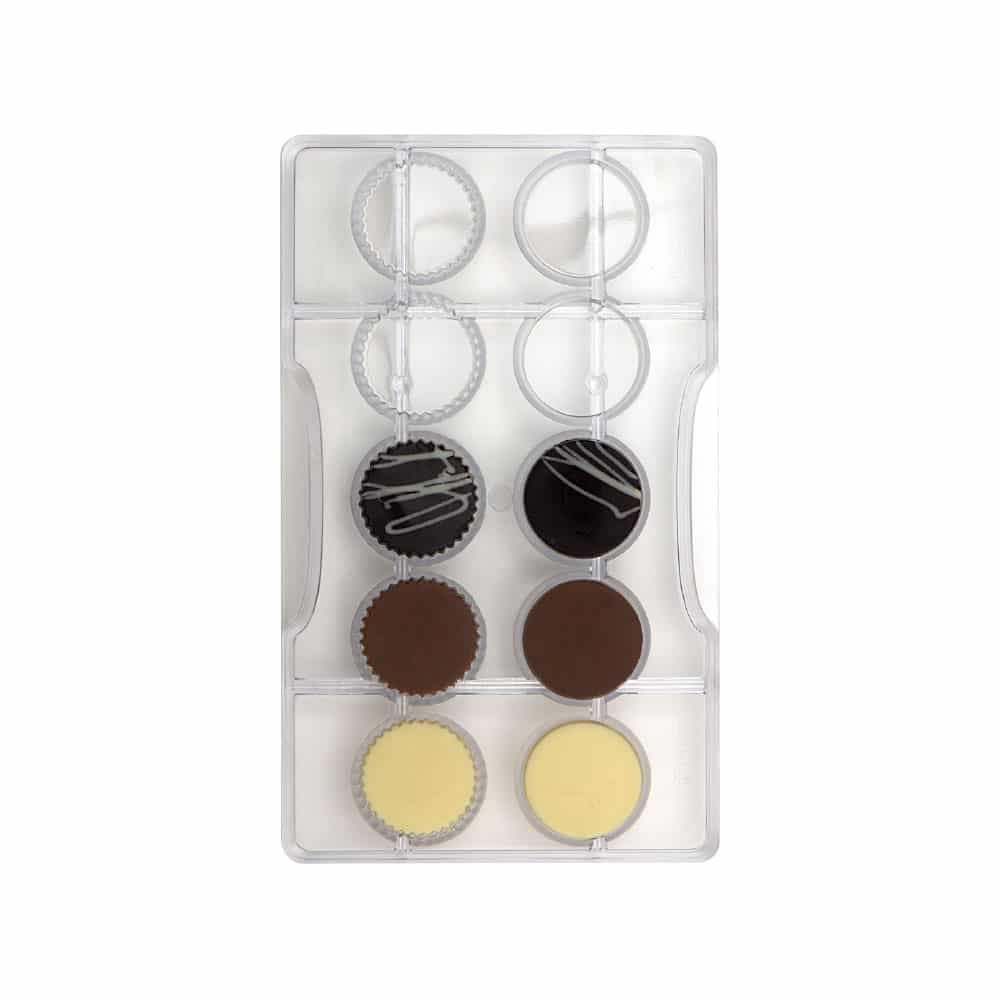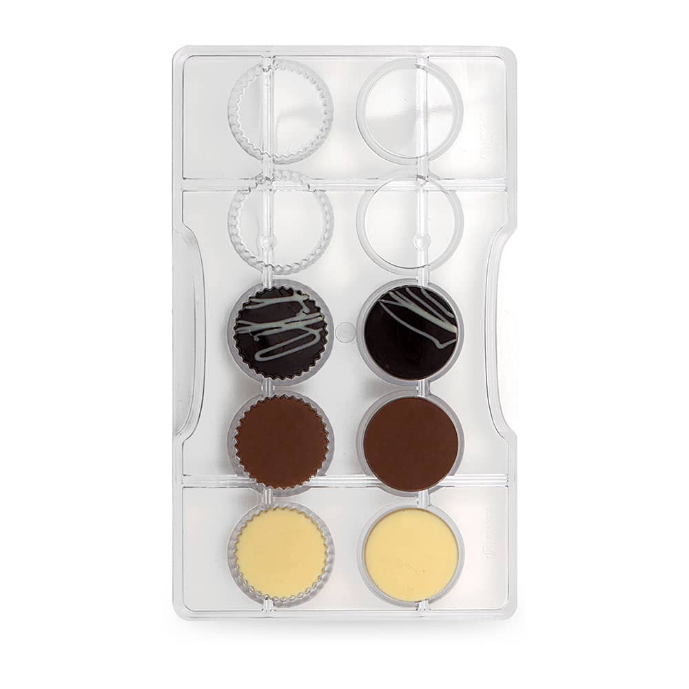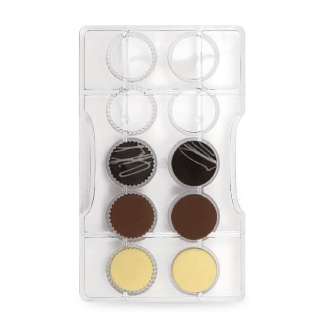 Stampo professionale in policarbonato, un materiale che consente di ottenere cioccolatini lucidi e perfetti. E’ importante temperare bene il cioccolato prima di versarlo nello stampo.