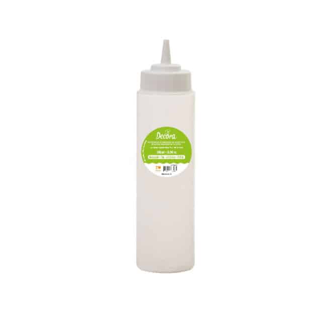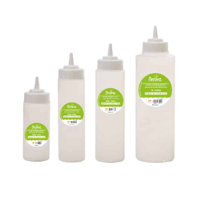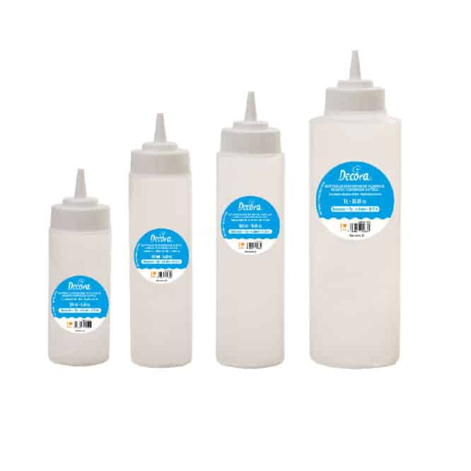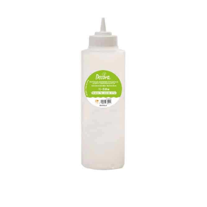 In plastica, con beccucci forati. Ideale per glasse, cioccolato e salse liquide.