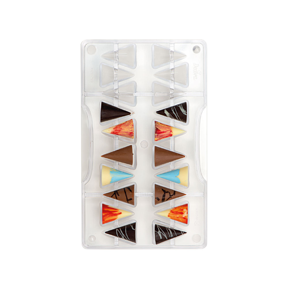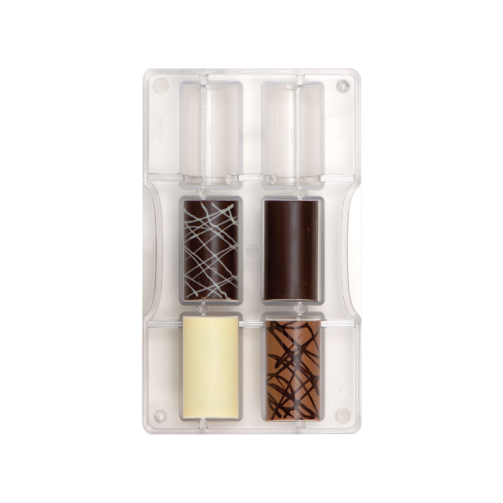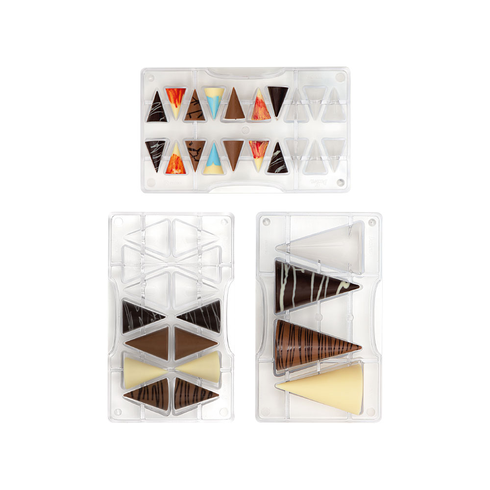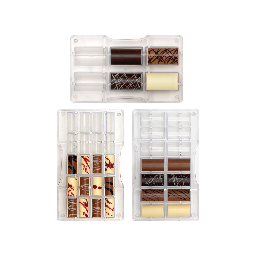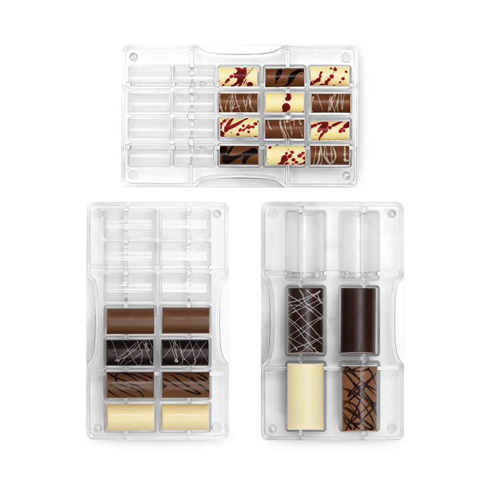 Stampi professionali in policarbonato, un materiale che consente di ottenere cioccolatini lucidi e perfetti. E’ importante temperare bene il cioccolato prima di versarlo nello stampo.