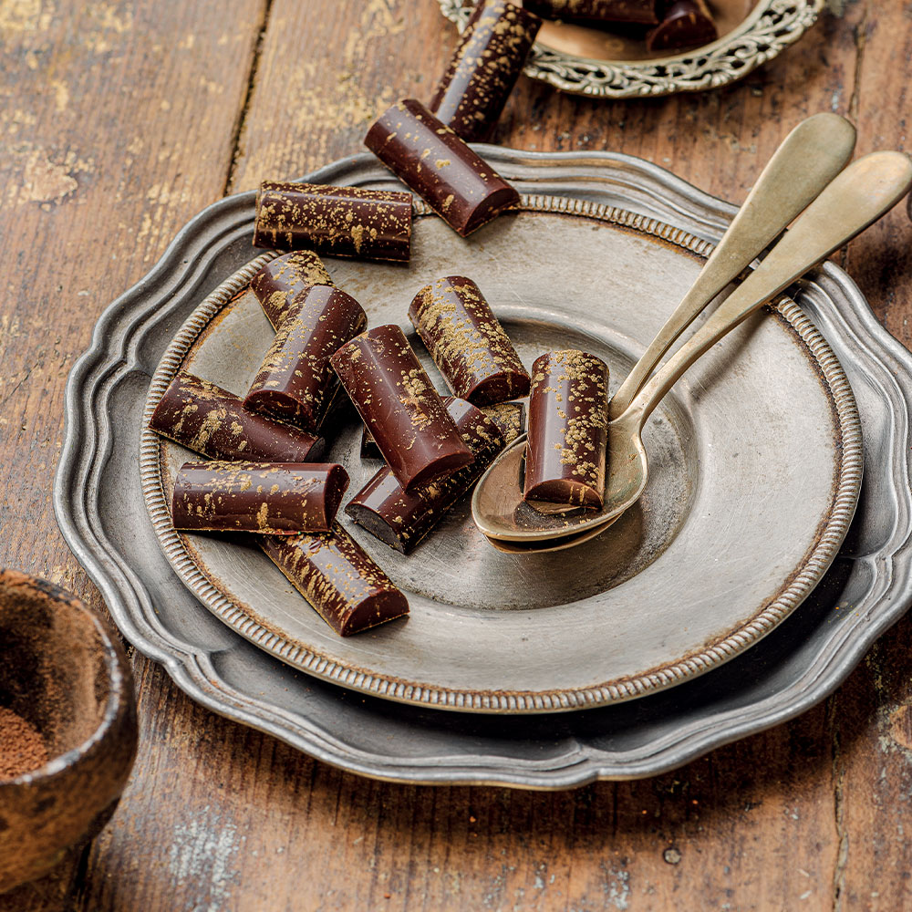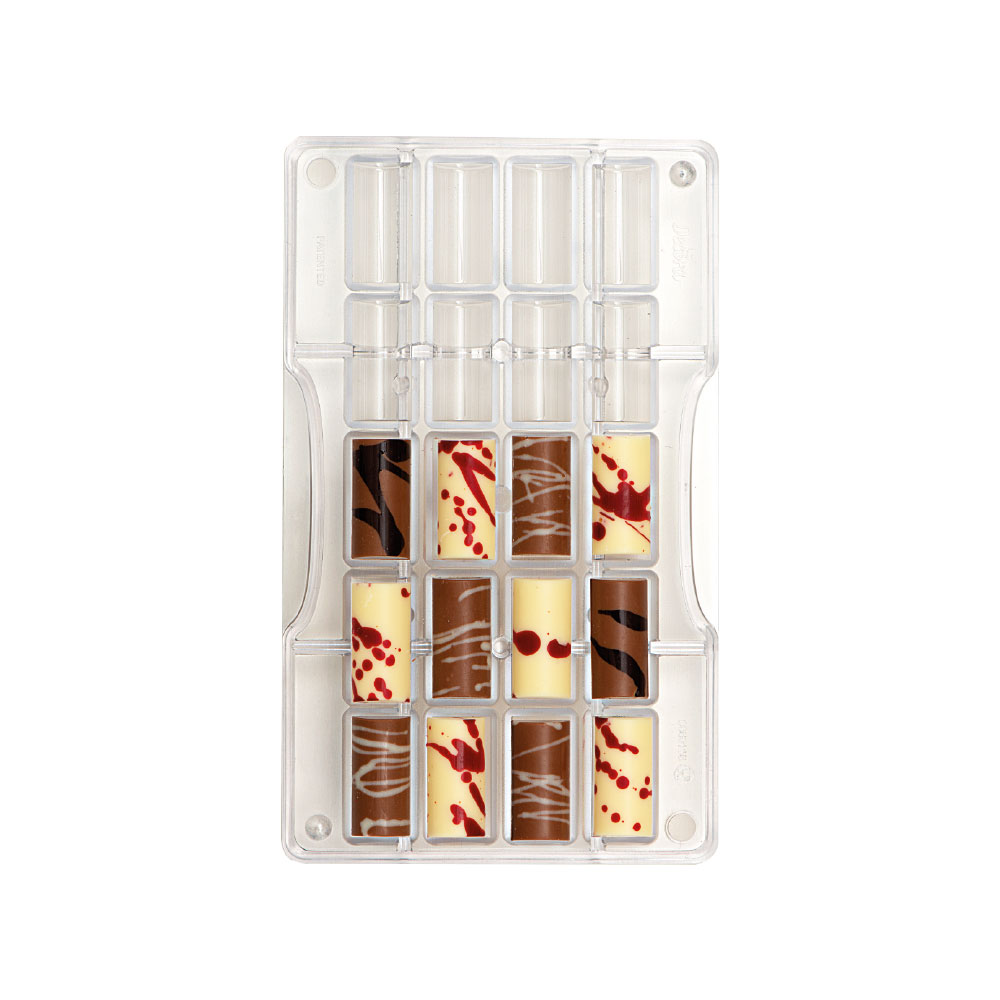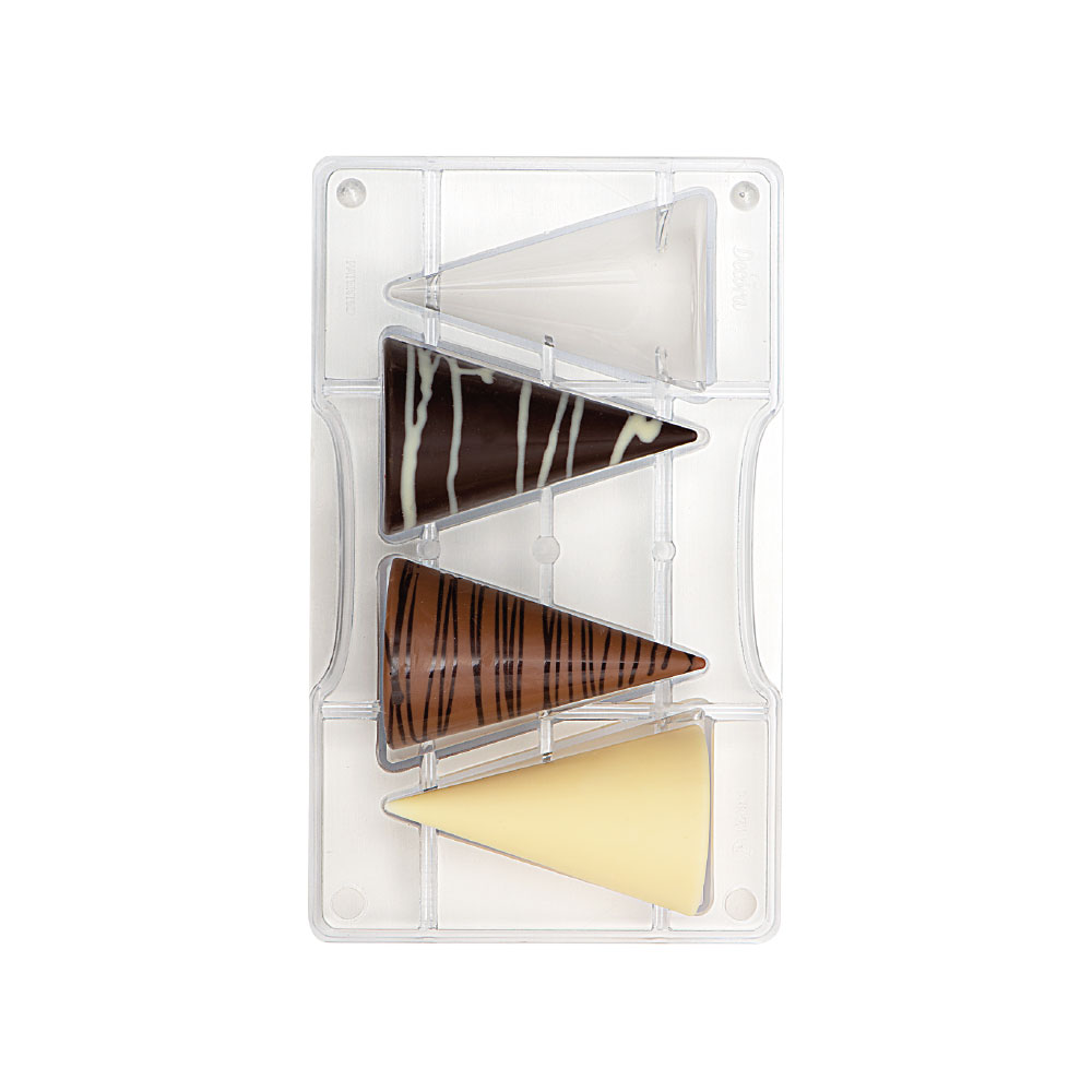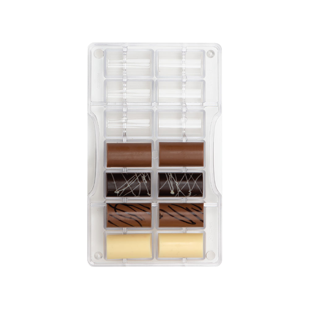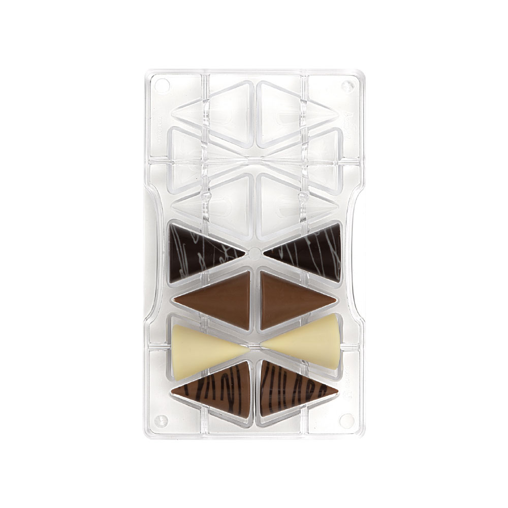 Stampi professionali in policarbonato, un materiale che consente di ottenere cioccolatini lucidi e perfetti. E’ importante temperare bene il cioccolato prima di versarlo nello stampo.