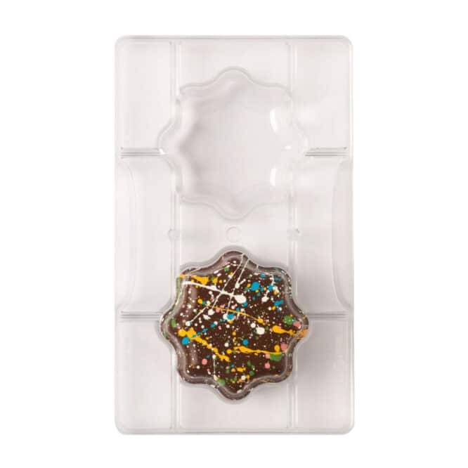 Stampo professionale in policarbonato, un materiale che consente di ottenere cioccolatini lucidi e perfetti. E’ importante temperare bene il cioccolato prima di versarlo nello stampo.