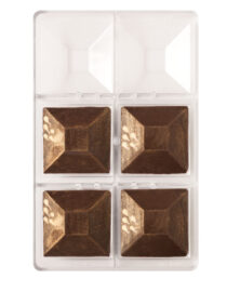 Stampo professionale in policarbonato, un materiale che consente di ottenere cioccolatini lucidi e perfetti. E’ importante temperare bene il cioccolato prima di versarlo nello stampo.