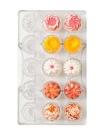 Stampo professionale in policarbonato, un materiale che consente di ottenere cioccolatini lucidi e perfetti. E’ importante temperare bene il cioccolato prima di versarlo nello stampo.