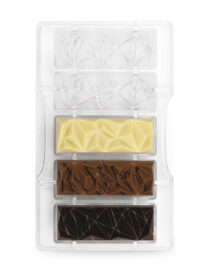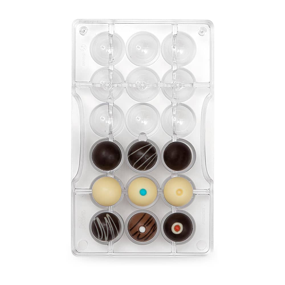Stampo professionale in policarbonato, un materiale che consente di ottenere cioccolatini lucidi e perfetti. E’ importante temperare bene il cioccolato prima di versarlo nello stampo.