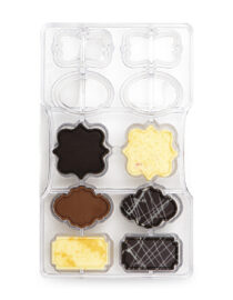 Stampo professionale in policarbonato, un materiale che consente di ottenere cioccolatini lucidi e perfetti. E’ importante temperare bene il cioccolato prima di versarlo nello stampo.