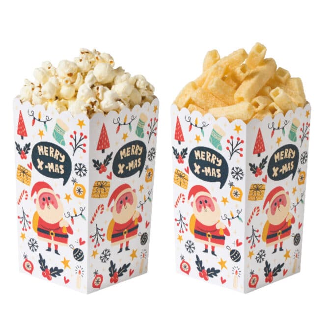 Descrizione: Box in cartone resistente, rivestiti all’interno con carta antigrasso, idonea al contatto alimentare. Perfetti per party ed eventi: sono ottimi elementi decorativi per il tavolo delle feste, ideali per servire popcorn, patatine o snack vari, sia dolci che salati.