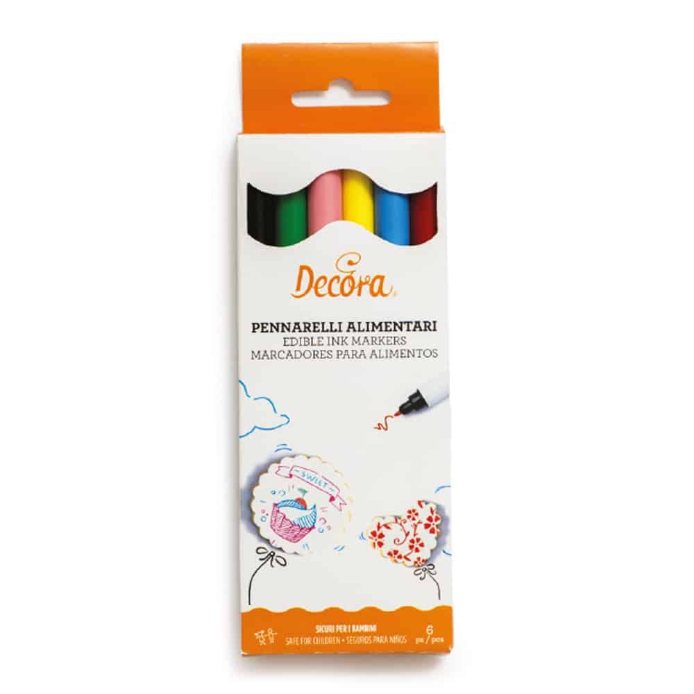 Pennarelli per alimenti ideali per disegnare su torte, biscotti e confetti. Colori: nero, verde, rosa, azzurro, rosso e giallo. Realizzati con coloranti di estrazione naturale. Confezione da 6 pezzi, colori assortiti. Prodotto Gluten Free!
