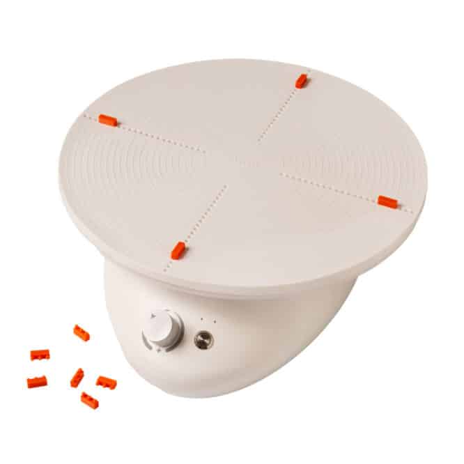 È dotato di tasselli che, inseriti negli appositi fori del piatto in silicone, possono essere utilizzati come riferimento per centrare sempre la base di appoggio, facilitando il lavoro di decorazione.