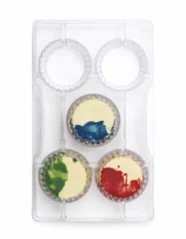 Stampo professionale in policarbonato, un materiale che consente di ottenere cioccolatini lucidi e perfetti. E’ importante temperare bene il cioccolato prima di versarlo nello stampo.