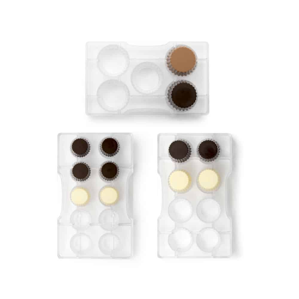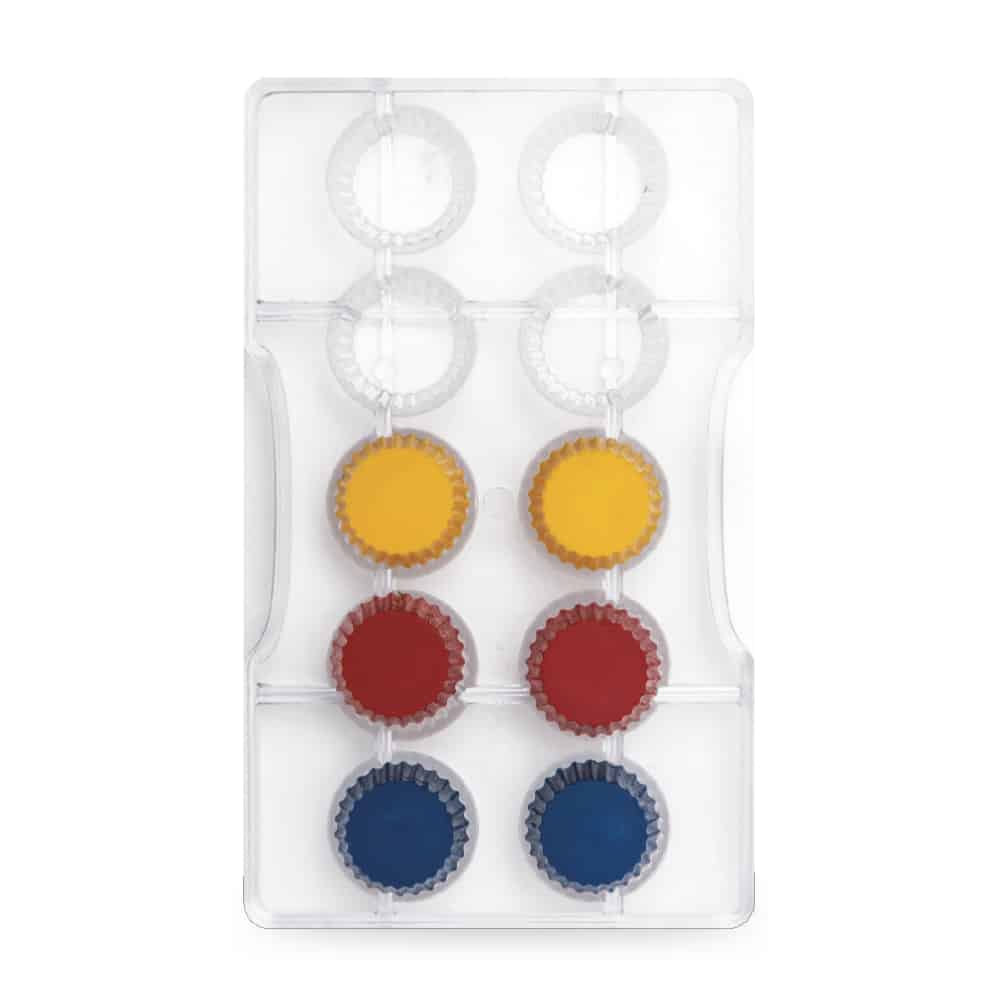 Stampo professionale in policarbonato, un materiale che consente di ottenere cioccolatini lucidi e perfetti. E’ importante temperare bene il cioccolato prima di versarlo nello stampo.