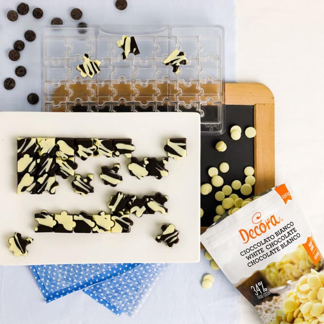 Stampo professionale in policarbonato, un materiale che consente di ottenere cioccolatini lucidi e perfetti. E’ importante temperare bene il cioccolato prima di versarlo nello stampo.