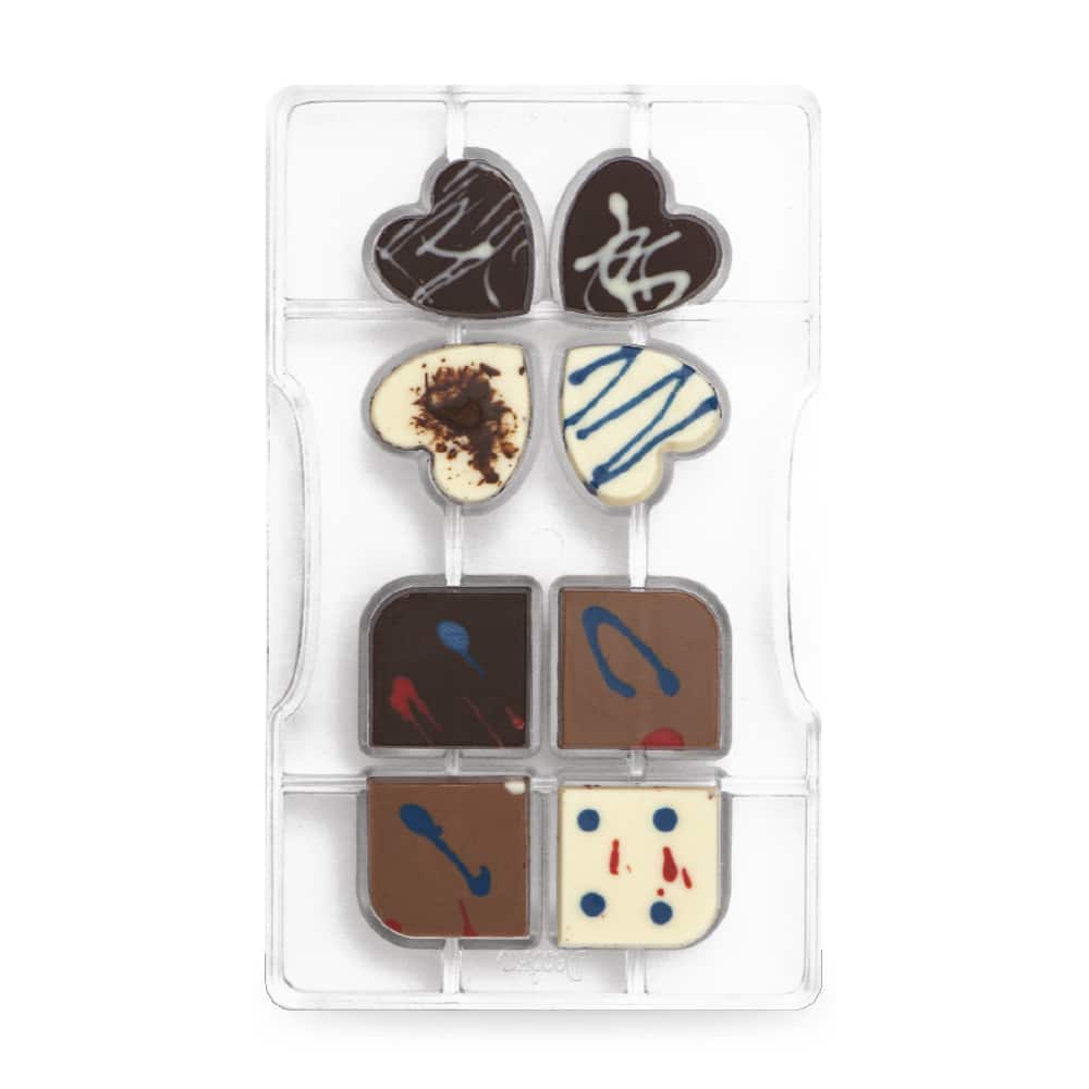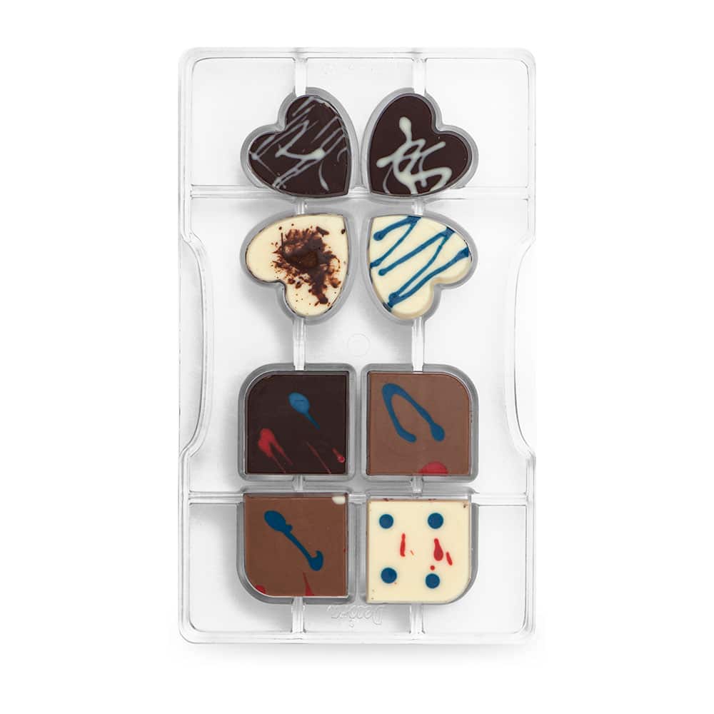 Stampo professionale in policarbonato, un materiale che consente di ottenere cioccolatini lucidi e perfetti. E’ importante temperare bene il cioccolato prima di versarlo nello stampo.