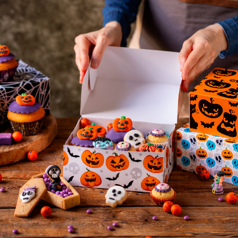 Scatola per dolcini automontante, in cartone resistente, idonea al contatto alimentare. Imbustata singolarmente. Ideale per confezionare pasticcini, ciambelle, cupcakes, biscotti e piccoli dolcetti e per regalare dolci pensierini fatti in casa a tema.
