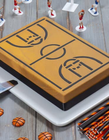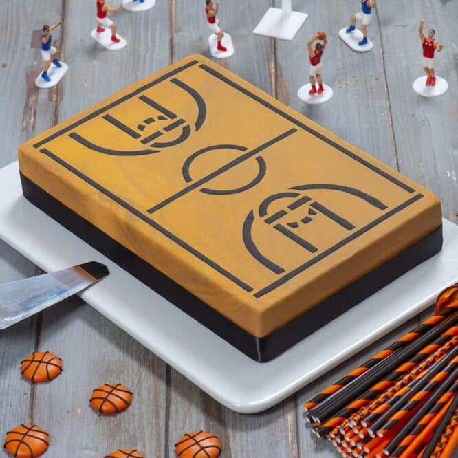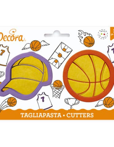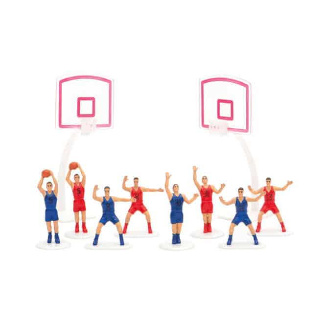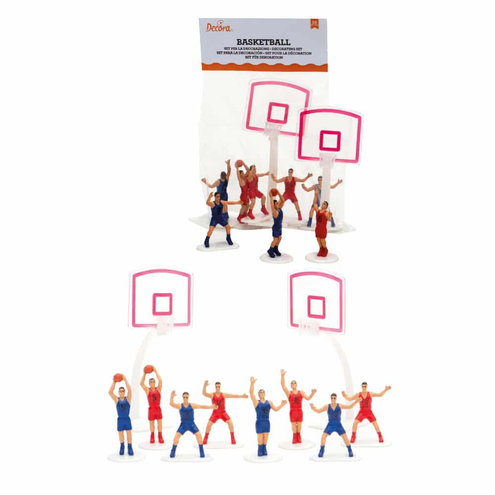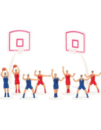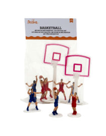 Set decorativo in plastica a tema basket perfetto per la decorazione di dolci. Il kit contiene 8 giocatori e 2 canestri.