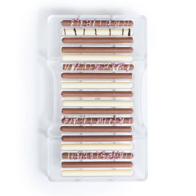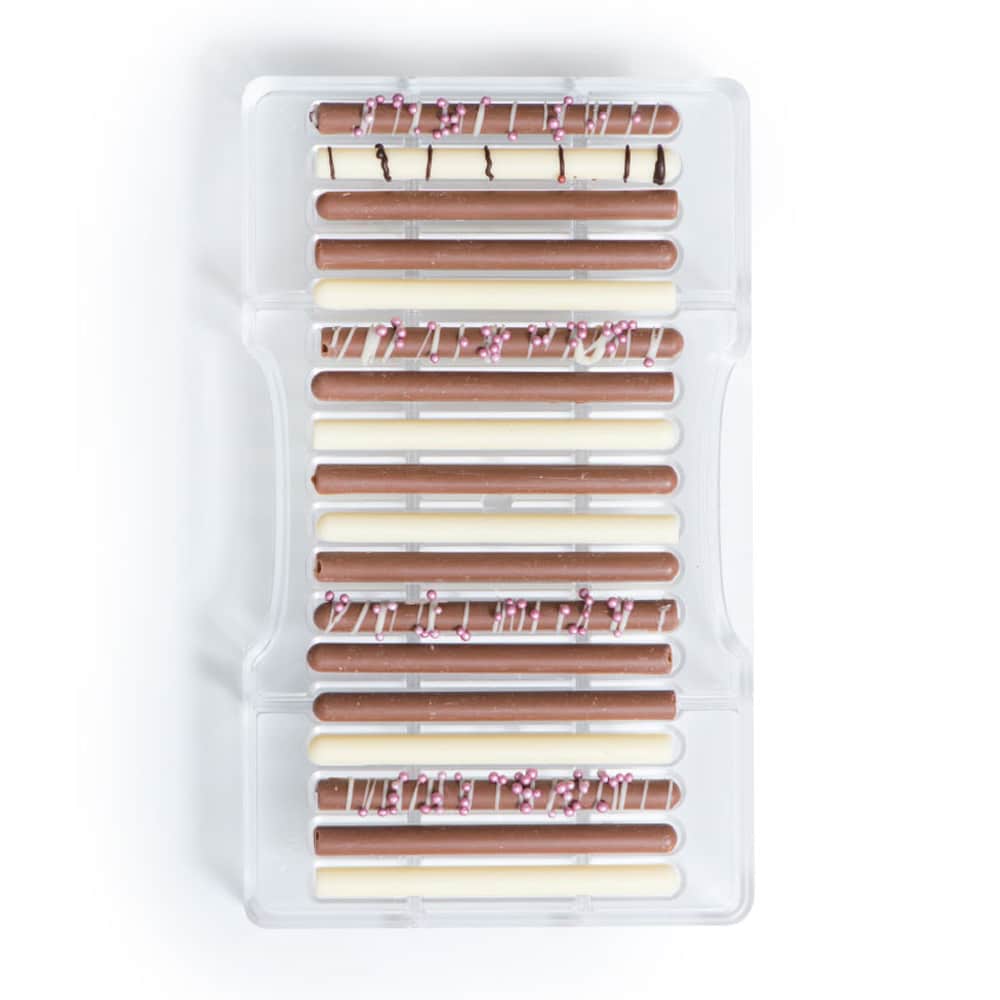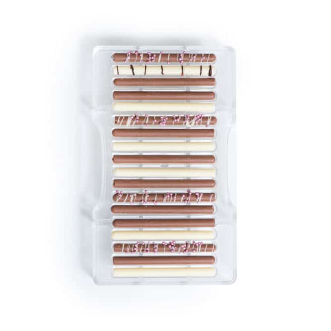 Stampo professionale in policarbonato, un materiale che consente di ottenere cioccolatini lucidi e perfetti. E’ importante temperare bene il cioccolato prima di versarlo nello stampo.