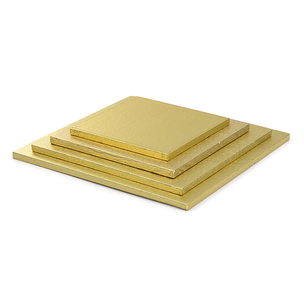 Sotto-torta rigidi quadrati, in pasta di cellulosa rivestiti con alluminio colorato. Imbustati singolarmente. Qualitร Premium.
