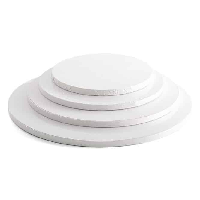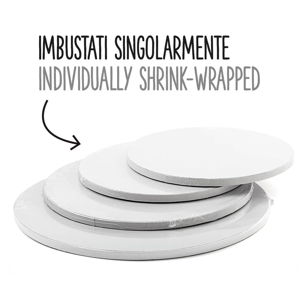 Sotto-torta rigidi rotondi, in cartone rivestiti con alluminio colorato. Imbustati singolarmente.