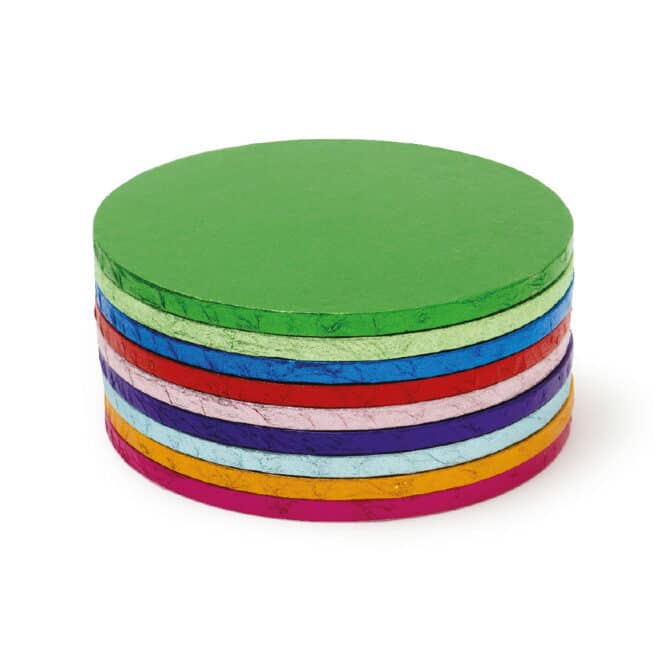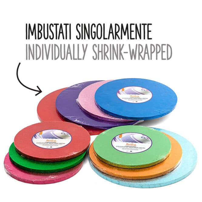 Sotto-torta rigidi in pasta di cellulosa rivestiti con alluminio colorato. Imbustati singolarmente. Qualitร Premium.