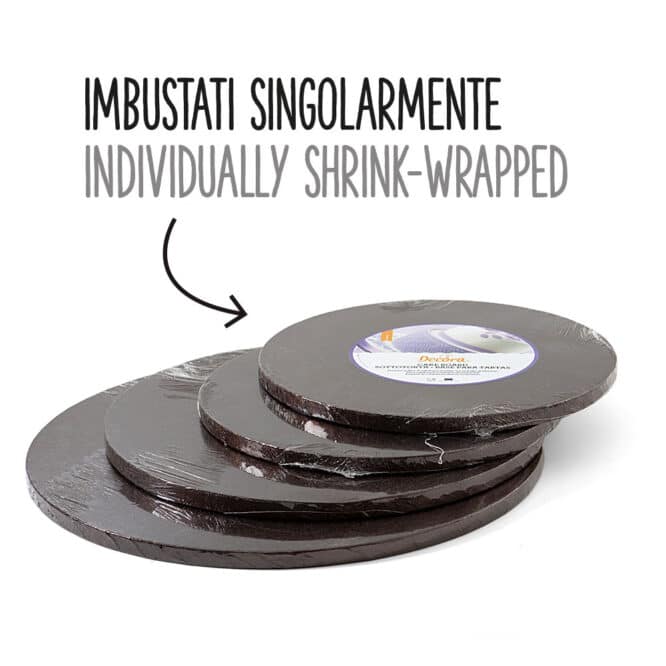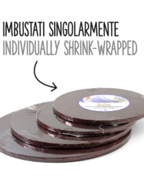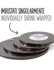 Sotto-torta rigidi in pasta di cellulosa rivestiti con alluminio colorato. Imbustati singolarmente. Qualitร Premium.