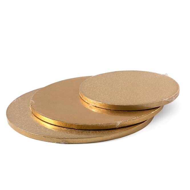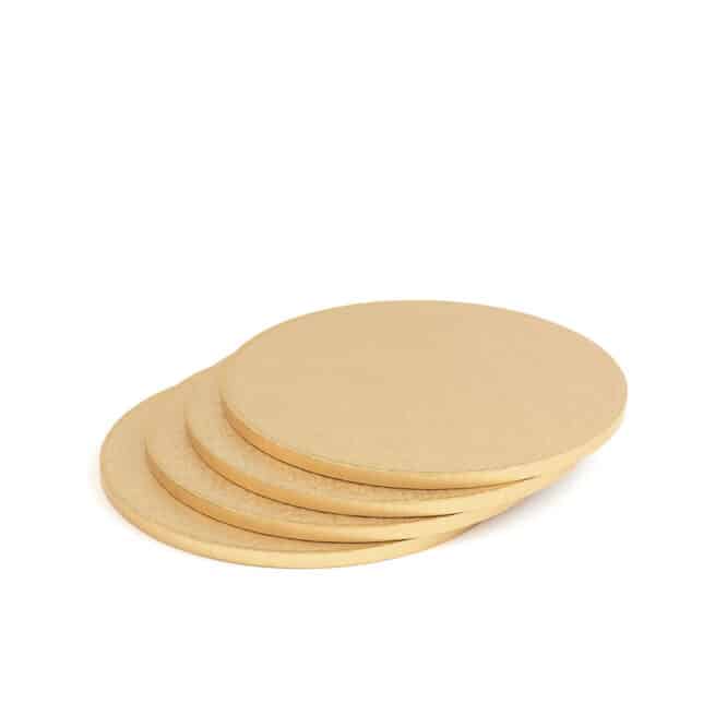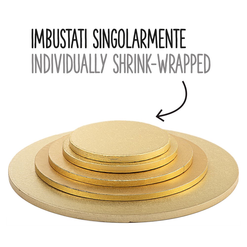 Sotto-torta rigidi rotondi, in cartone rivestiti con alluminio colorato. Imbustati singolarmente.