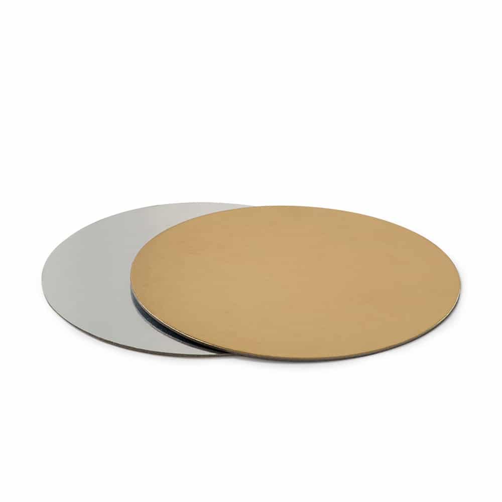 Sottotorta rotondi accoppiati in cartone, ricoperti con una pellicola impermeabile. Superficie laminata in entrambi i lati una con colore oro e l’altra con colore argento. Imbustati singolarmente.
