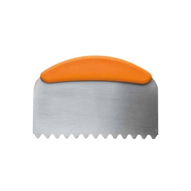 Spatola in acciaio inox con un comodo manico ergonomico e antiscivolo. La spatola ondulata è perfetta per decorare i bordi delle torte con texture originali. La lama lunga oltre 20 cm la rende adatta anche a torte molte alte.