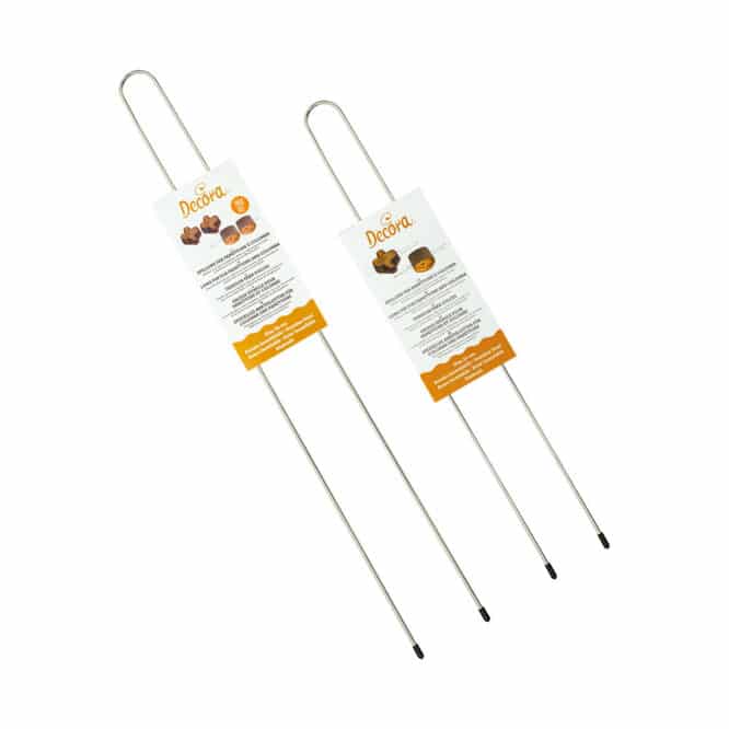 In acciaio inox. Si utilizzano per capovolgere colombe o panettoni durante le fasi di raffreddamento del dolce.