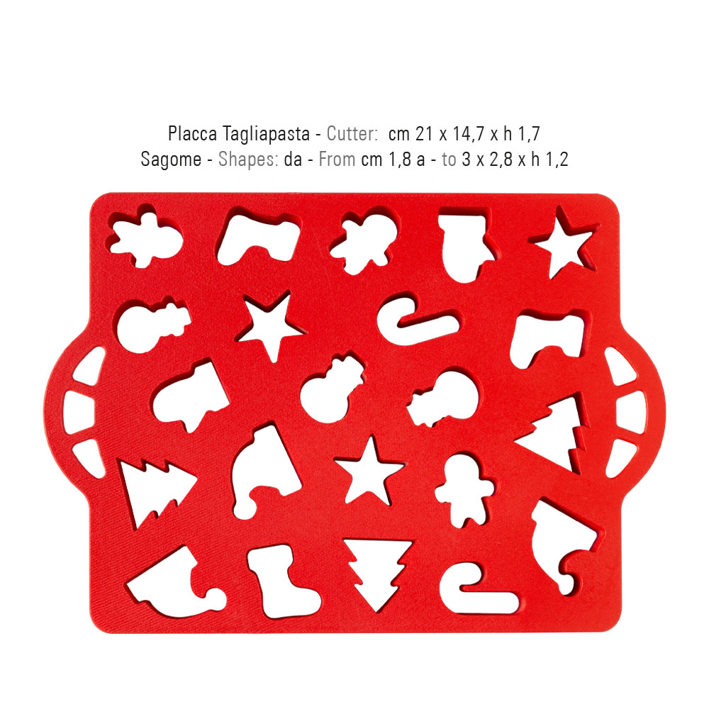 Dimensione placca tagliapasta: cm 21 x 14,7 x h 1,7 Dimensione biscotti: cm da 1,8 a 3 x 2,8 x h 1,2