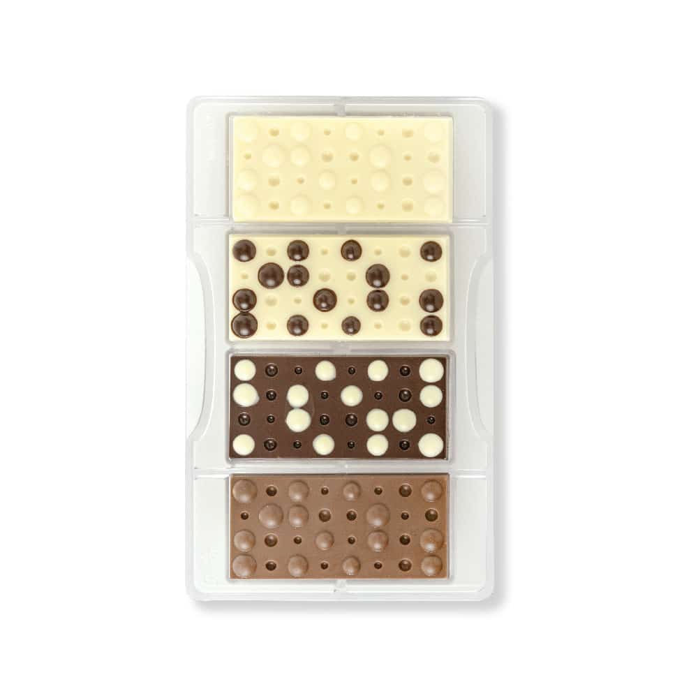 Stampo professionale in policarbonato, un materiale che consente di ottenere cioccolatini lucidi e perfetti. E’ importante temperare bene il cioccolato prima di versarlo nello stampo.