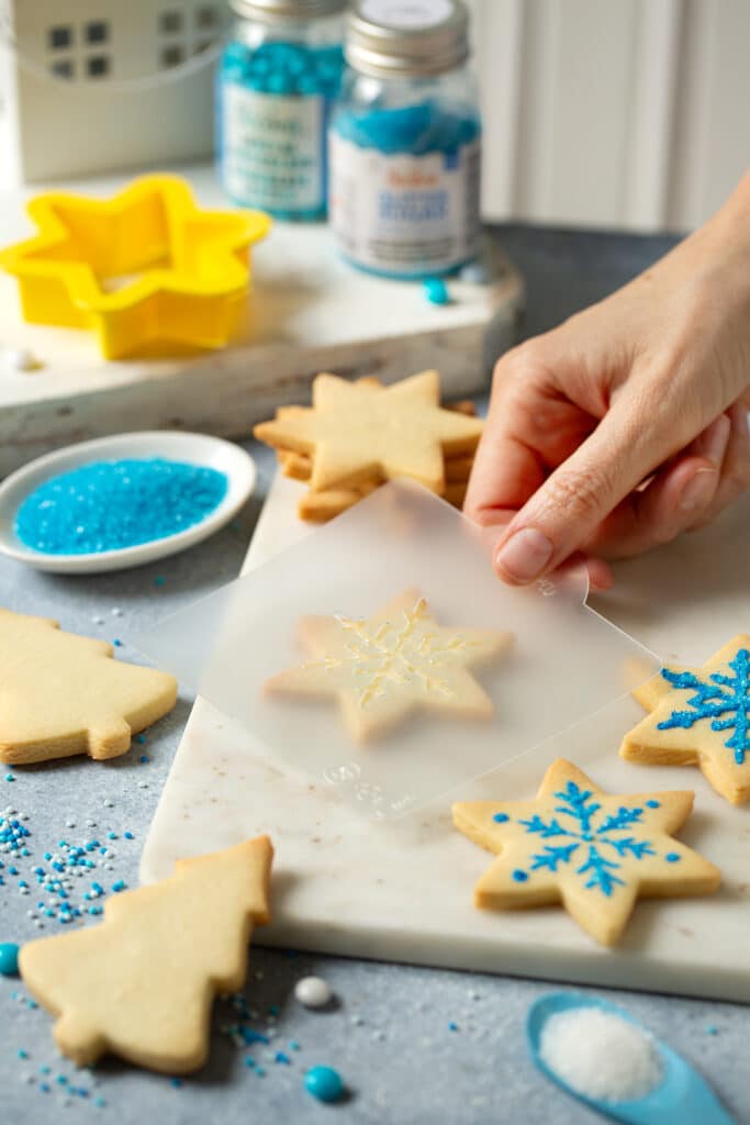 Per un effetto glamour realizza le decorazioni usando lo zucchero glitterato: applica lo stencil sul biscotto, stendi prima uno strato sottile di gelatina con un pennellino.