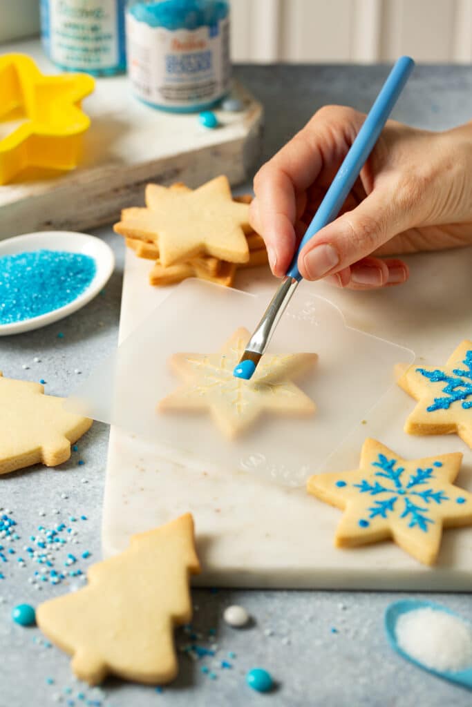 Applica lo stencil sul biscotto e, con un pennellino o un pennarello alimentare, colora i dettagli con il colorante.