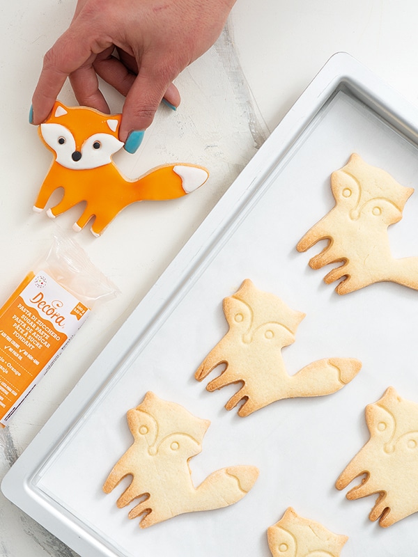 Taglia il burro freddo a dadini e lavoralo velocemente insieme alla farina fino a ottenere una consistenza sabbiosa. Unisci lo zucchero a velo e qualche goccia di aroma alla vaniglia a piacere. Aggiungi l’uovo e lavora tutti gli ingredienti fino a ottenere un impasto liscio. Avvolgi l’impasto nella pellicola e lascialo riposare in frigorifero per almeno 30 minuti. Stendilo con un mattarello e, con un tagliapasta a forma di volpe, ricava i biscotti. Disponili su una teglia rivestita di carta da forno e cuocili in forno statico a 160°C per circa 12 minuti.