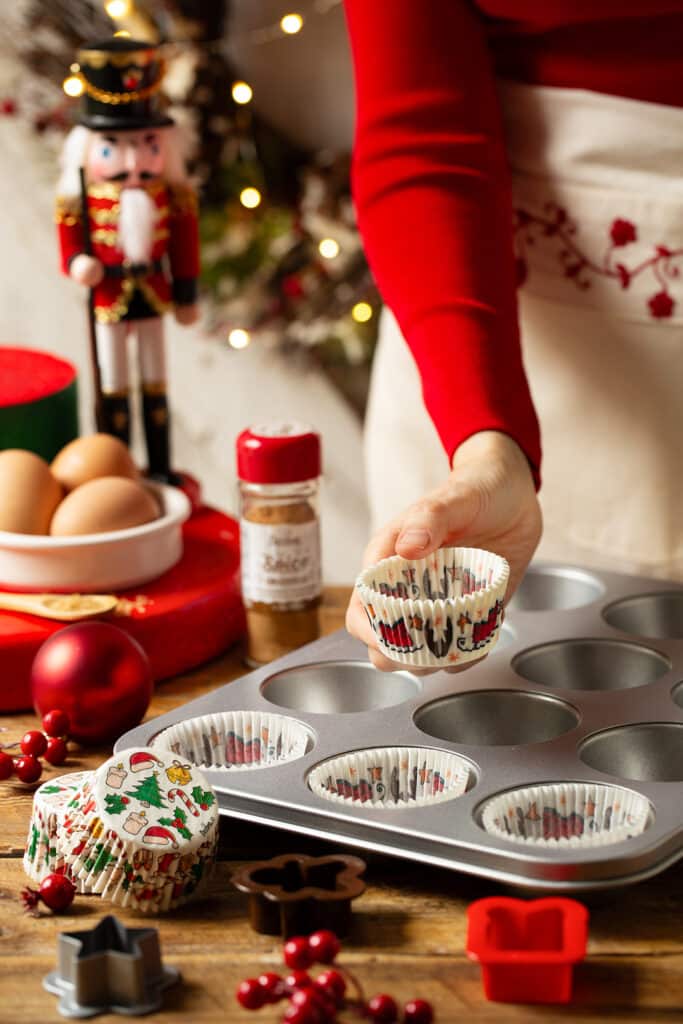 In una ciotola monta le uova con lo zucchero di canna usando le fruste elettriche, poi aggiungi l’estratto di vaniglia, lo yogurt a temperatura ambiente e l’olio di semi. Amalgama con una spatola fino a ottenere un composto uniforme. Incorpora la farina, il cacao amaro, il lievito, il preparato Gingerbread e un pizzico di sale. Lavora ancora con le fruste fino a ottenere un impasto omogeneo. Trasferisci il composto in una sac à poche e riempi i pirottini natalizi per circa tre quarti. Cuoci in forno statico a 180°C per 20 minuti e lascia raffreddare.