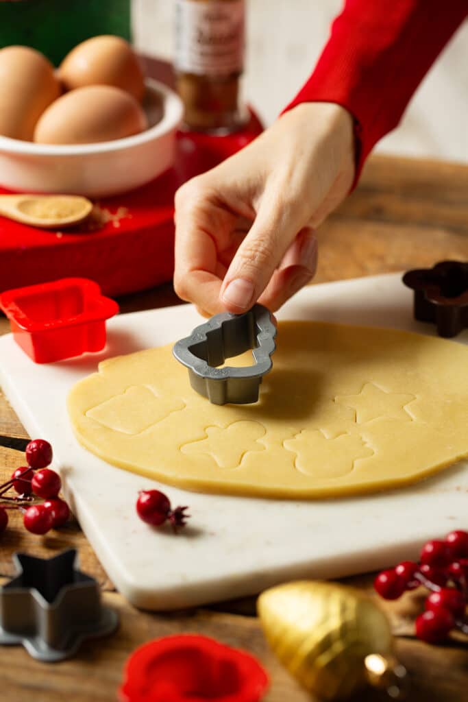 Prepara ora la frolla per i biscottini di Natale. In una ciotola unisci farina, zucchero, un pizzico di sale e burro, poi lavora tutto con le mani fino a ottenere un composto sabbioso. Aggiungi l’uovo leggermente sbattuto e impasta velocemente, finché la frolla risulterà morbida ed elastica. Stendila con il mattarello su un foglio di carta forno e lasciala riposare in frigorifero per un’ora. Riprendi la frolla, stendila e ricava i biscottini con i mini tagliapasta di Natale. Cuocili in forno statico a 180°C per circa 10 minuti.