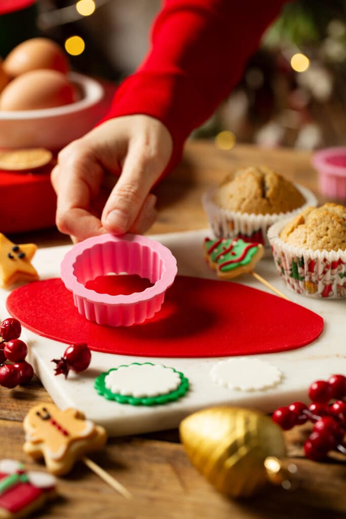 Posiziona i cerchi di pasta di zucchero sui muffin e completa con i biscottini decorati applicati con uno stecchino: i tuoi dolcetti di Natale sono pronti per stupire tutti!