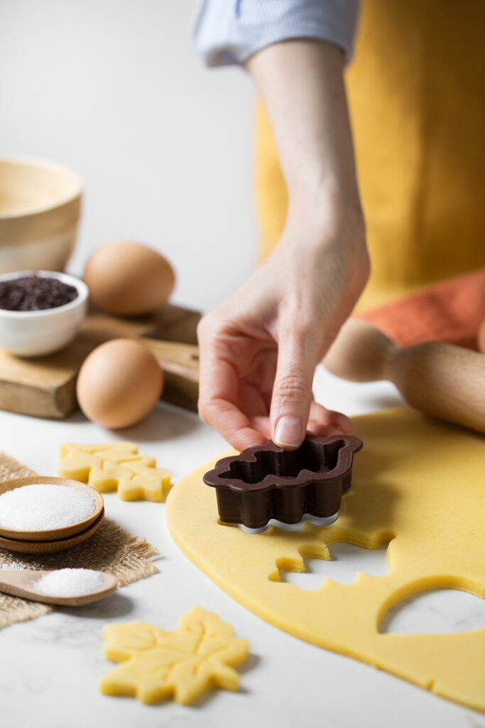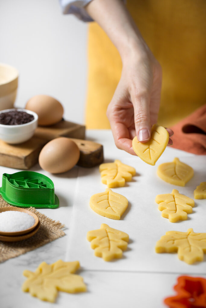Con i tagliapasta ritaglia i biscotti, posizionali su una teglia per biscotti rivestita di carta da forno. Cuocili a 180°C per 12–15 minuti. Lasciali raffreddare su una griglia.