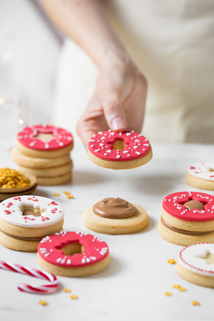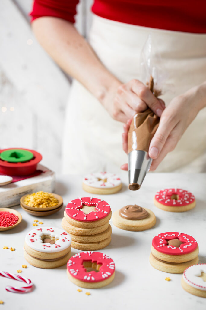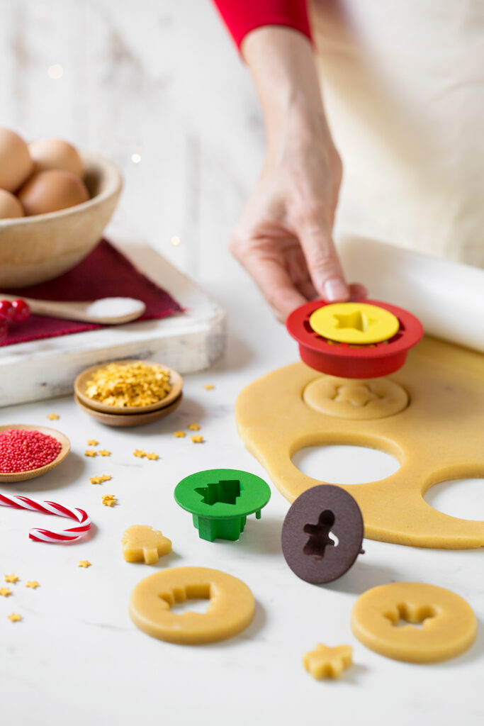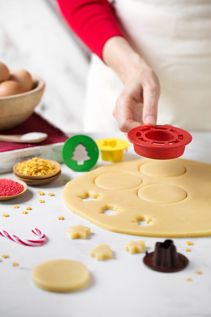 Ritaglia prima la base con il tagliapasta grande e poi la parte superiore forata posizionando all’interno del tagliapasta grande uno dei tagliapasta intercambiabili più piccoli. Disponi i biscotti su una teglia rivestita con tappetino microforato e cuoci in forno statico preriscaldato a 180° per 10-14 minuti. Una volta cotti, lasciali raffreddare completamente.