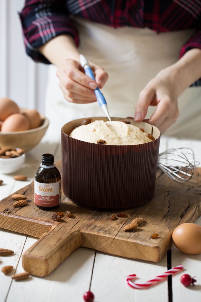 Preriscalda il forno statico a 180 °C. Inforna il panettone per 10 minuti. Riduci la temperatura a 160 °C e cuoci per altri 35 minuti. Verifica la cottura con la prova stecchino. Una volta cotto, infiilza il panettone con l'apposito spillone e lascia raffreddare capovolto prima di tagliarlo.