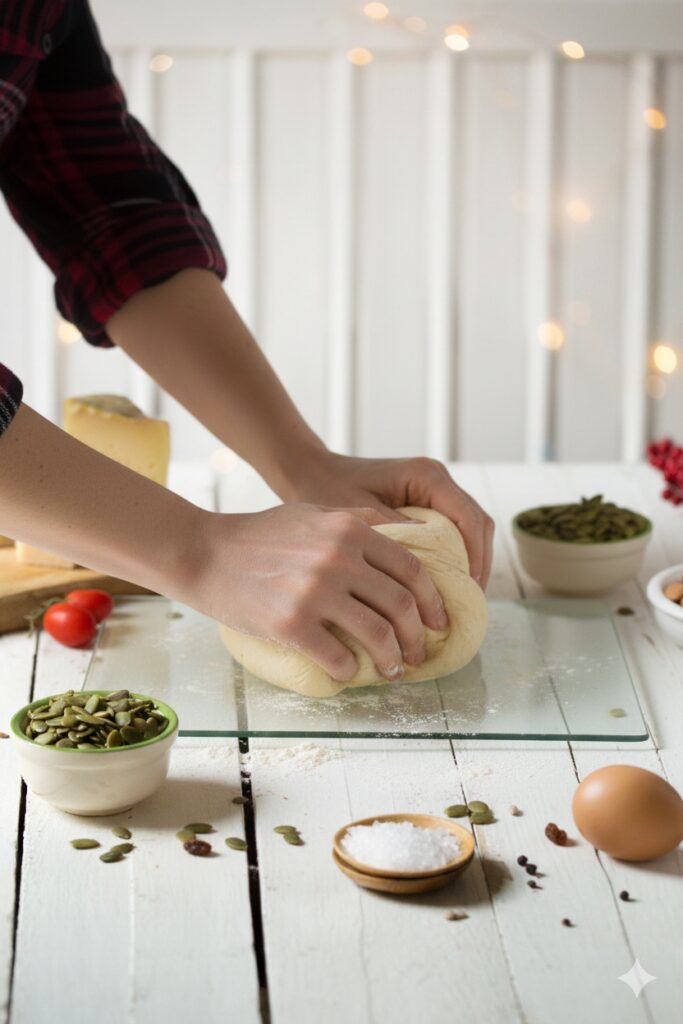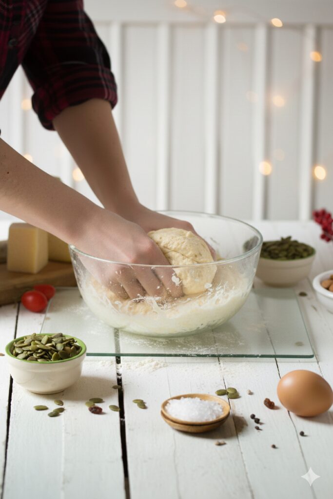 Lavora l’impasto in planetaria per altri 10 minuti, poi trasferiscilo sul piano di lavoro. Sgonfia delicatamente l’impasto, forma una palla e inseriscila nello stampo in carta. Cospargi la superficie con semi di zucca tostati. Lascia lievitare in forno spento fino a quando l’impasto raggiunge il bordo dello stampo. (circa 5-6 ore).