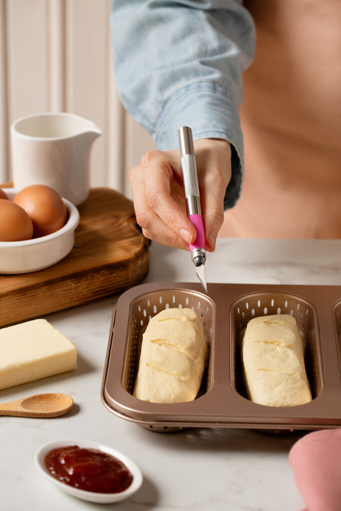 Sciogli il lievito di birra nel latte tiepido con un cucchiaino di zucchero e lascia riposare 5-10 minuti fino a quando si formerà una leggera schiuma. Nella ciotola della planetaria, unisci la farina, lo zucchero, lo zucchero vanigliato e il latte con il lievito sciolto. Mescola velocemente. Aggiungi il sale e l’uovo e impasta fino a ottenere un composto omogeneo. Incorpora il burro a cubetti e continua a impastare fino a ottenere un impasto liscio, elastico e ben incordato. Forma una palla, copri con pellicola o un canovaccio umido e lascia lievitare fino al raddoppio, circa 1 ora (più rapido rispetto al lievito madre). Dividi l’impasto in 10 pezzi e forma dei filoncini lisci di circa 12 cm. Pratica due intagli obliqui sulla superficie di ogni panino e spennella con un po’ di latte. Cop