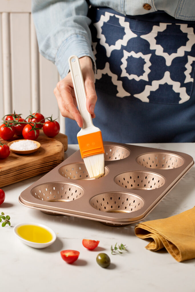 Sciogli il lievito nell’acqua. Nella ciotola dell’impastatrice metti la farina, la patata schiacciata, il sale, il concentrato di pomodoro e metà dell’acqua. Inizia a impastare, aggiungendo l’acqua rimanente poco alla volta: potrebbe non servire tutta, dipende dalla farina. Quando l’impasto è ben incordato, incorpora l’olio a filo. L’impasto deve risultare liscio, morbido ma non appiccicoso. Forma una palla, trasferiscila in un contenitore graduato e fai lievitare fino al raddoppio. Dividi l’impasto in palline da circa 28 g ciascuna. Prendi ogni pallina e disponila nella teglia ben imburrata con olio o burro fuso.