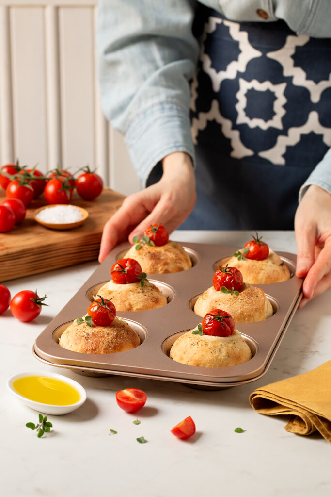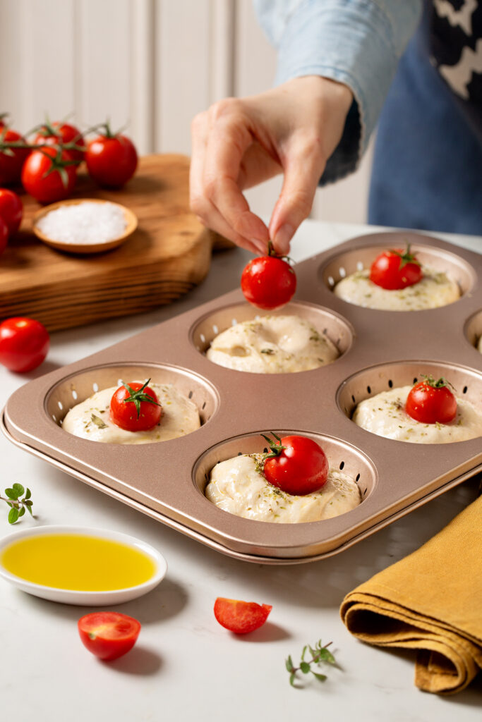 Copri e lascia lievitare di nuovo fino al raddoppio. Decora con pomodorini tagliati a metà e un po’ di origano. Cuoci in forno preriscaldato a 180°C per circa 25 minuti, o fino a doratura completa.