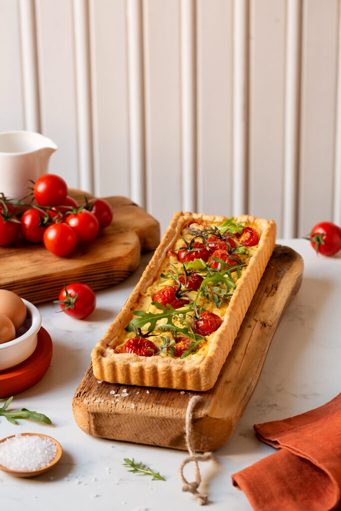 Togli la base dal forno e versa il composto di uova. Distribuisci i pomodorini sopra in modo uniforme. Continua la cottura in forno ventilato a 180°C per circa 35-40 minuti, fino a quando la superficie sarà dorata.